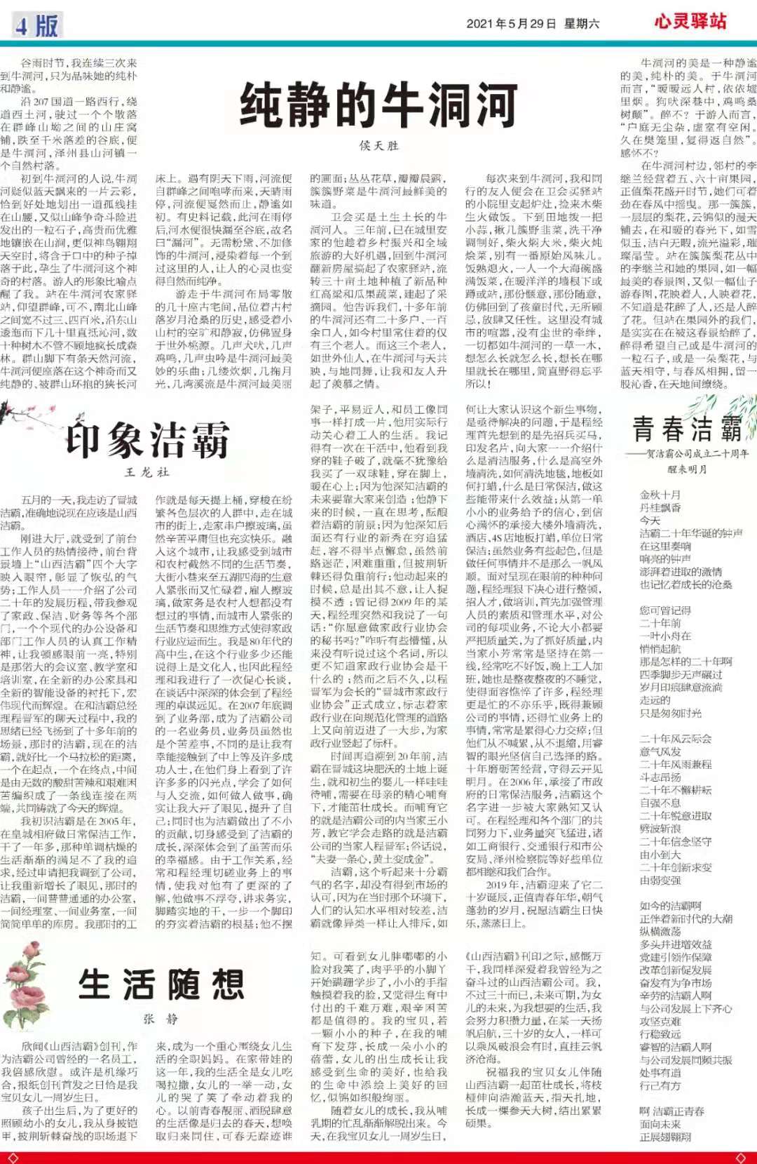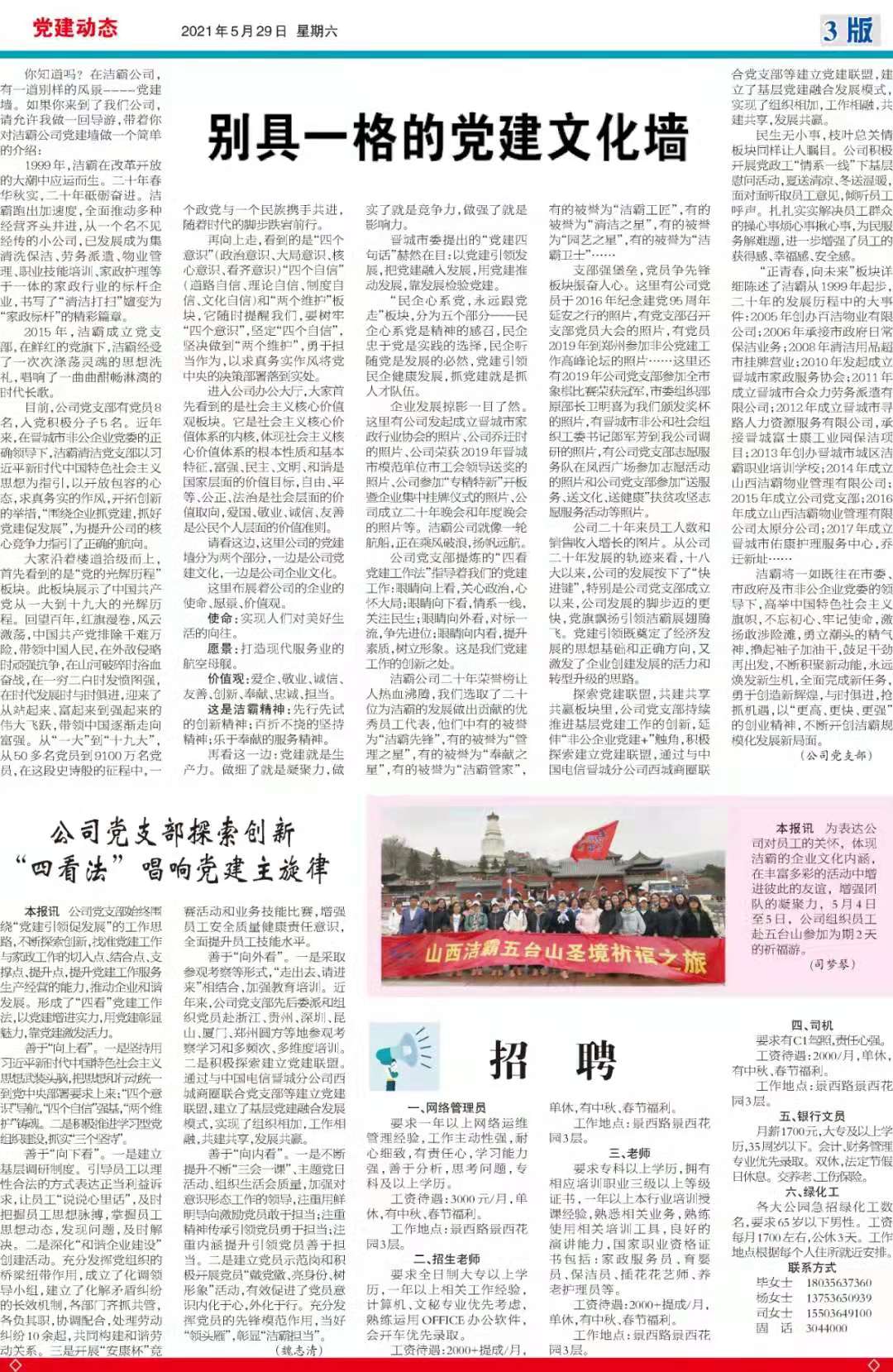 今天是2021年5月29日,經過一個多月的緊張籌辦,《山西潔霸》報紙終于創(chuàng)刊啦!這是潔霸人的一件大喜事,也是潔霸人的驕傲!伴隨著《山西潔霸》紙質版的內部發(fā)行,電子版也同步與你見面了。希望你能通過這個宣傳窗口,更好地走近潔霸,了解潔霸,關注潔霸,支持潔霸。