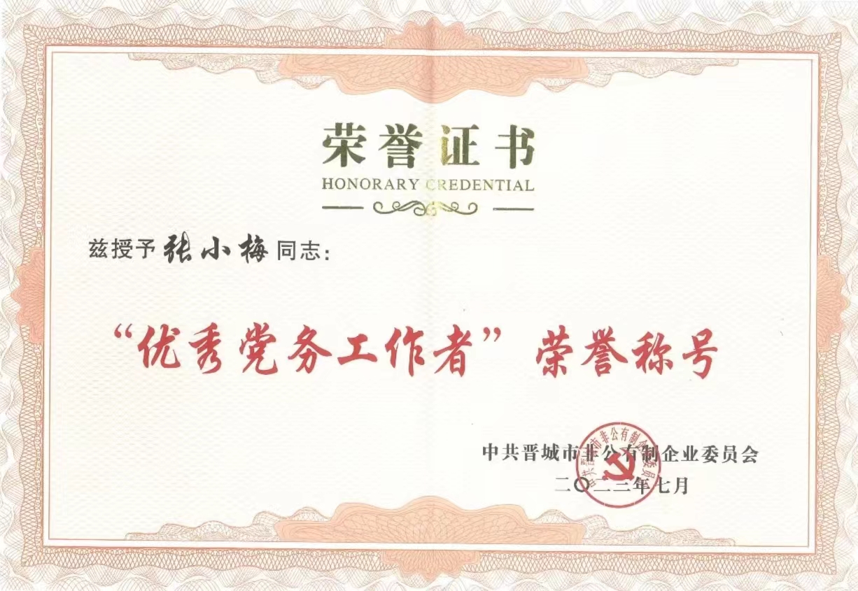 此次被市非公企業(yè)黨委授予“先進基層黨組織”稱號,是公司黨支部連續(xù)第五年獲得此項殊榮。近年來,公司黨支部堅持黨建引領(lǐng),抓陣地,建機制,壯隊伍,提素質(zhì),設(shè)立黨員示范崗、示范區(qū),廣泛開展“戴黨徽、亮身份、樹形象”活動,持續(xù)推進黨建與生產(chǎn)經(jīng)營深度融合,真正賦能企業(yè)高質(zhì)量發(fā)展。公司先后榮膺省、市級授予的“守合同重信用單位”“巾幗創(chuàng)業(yè)基地”“家政服務(wù)先進單位”“商貿(mào)流通工作先進單位”“山西省‘四新’中小企業(yè)”“晉城市模范單位”等榮譽稱號。等殊榮,公司黨支部分別獲得“‘雙強六好’省級示范黨組織”“‘雙強六好’市級示范黨組織”晉城市基層黨組織規(guī)范化建設(shè)示范點”等榮譽稱號。