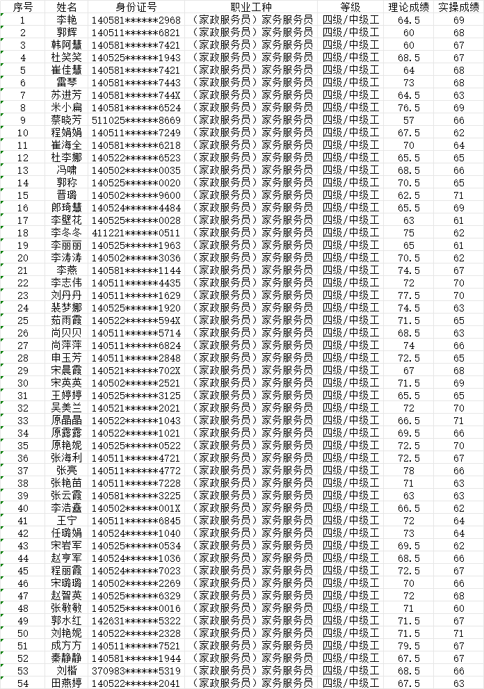 晉城市潔霸清潔服務(wù)股份有限公司職業(yè)技能等級(jí)認(rèn)定中心現(xiàn)將2024年1月27日上午認(rèn)定人員成績(jī)公示如下: