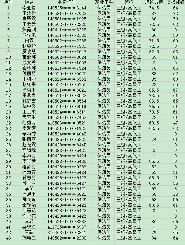晉城市潔霸清潔服務(wù)股份有限公司職業(yè)技能等級(jí)認(rèn)定中心現(xiàn)將2024年5月12日認(rèn)定人員成績(jī)公示如下: