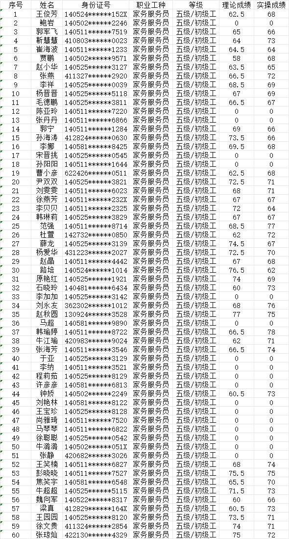202477日第19批家政服務(wù)員初級(jí)認(rèn)定人員成績(jī)公示